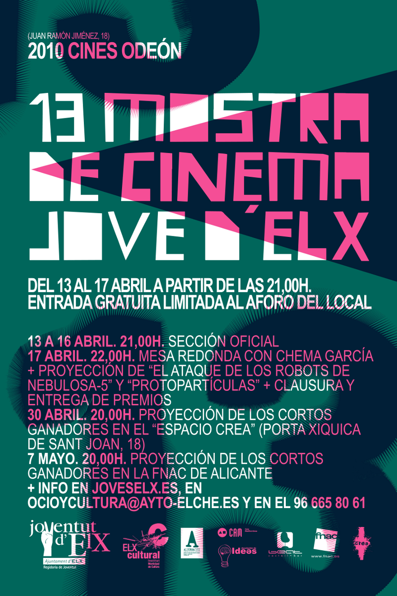 13 Mostra de Cinema Jove d'Elx PROGRAMACIÓN MOSTRA DE CINEMA JOVE D´ELX 2010Vuelve la Mostra de Cinema Jove d'Elx en su treceava edición; un festival que se celebra en nuestra ciudad en el que podemos ver como anda el panorama del cine ilicitano y repasar también la oferta nacional. Os ofrecemos desinteresadamente la programación para que podáis seguir el festival. Las citas de proyecciones son en los Cines Odeon a las 21.00h. La entrada es libre. La entrega de premios será el sábado 17 de Abril. ¡Disfutad del cine en su estado más atrevido y corto!